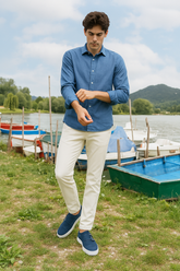 Sneakers mit Double Guglielmo -Schnalle sind eine Neuheit aus der Duca di Morrone 2025 -Kollektion. Elegante Männer elegante Schuhe in der Blue Sunsworks -Version, um im Frühling/Sommer nicht auf Stil und Eleganz aufzugeben. Mit Gummi -Sohle sind sie bequeme Schuhe, die für alle Outfits geeignet sind, informell und lässig. 100% in Italien gemacht,