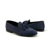 Der gesamte Made in Italy-Stil und die Qualität unserer Herrenmokassins mit Quasten aus echtem blauem Wildleder und Gummisohle, handgefertigt von italienischen Kunsthandwerkern.