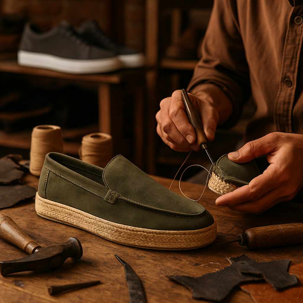 Il processo inizia con la scelta del pellame, studiato per garantirne la qualità e la resistenza. Dopo il taglio e il martellamento, la tomaia viene cucita a mano con macchinari di ultima generazione, ed il filo usato è in puro cotone. Successivamente, la suola è incollata con una tecnica meticolosa che prevede un attacco robusto e duraturo.