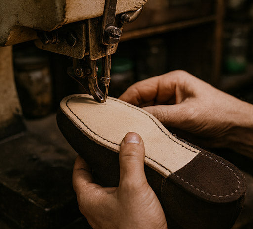 Il processo inizia con la scelta del pellame, studiato per garantirne la qualità e la resistenza. Dopo il taglio e il martellamento, la tomaia viene cucita a mano con macchinari di ultima generazione, ed il filo usato è in puro cotone. Successivamente, la suola è incollata con una tecnica meticolosa che prevede un attacco robusto e duraturo.